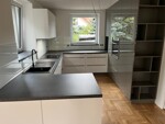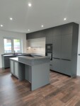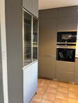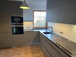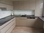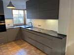Dvířka Prachově šedá Mat, pohledové boky Prachově šedá Mat. zadní deska sklo, pracovní deska Silestone Eternal Marquina Suede