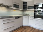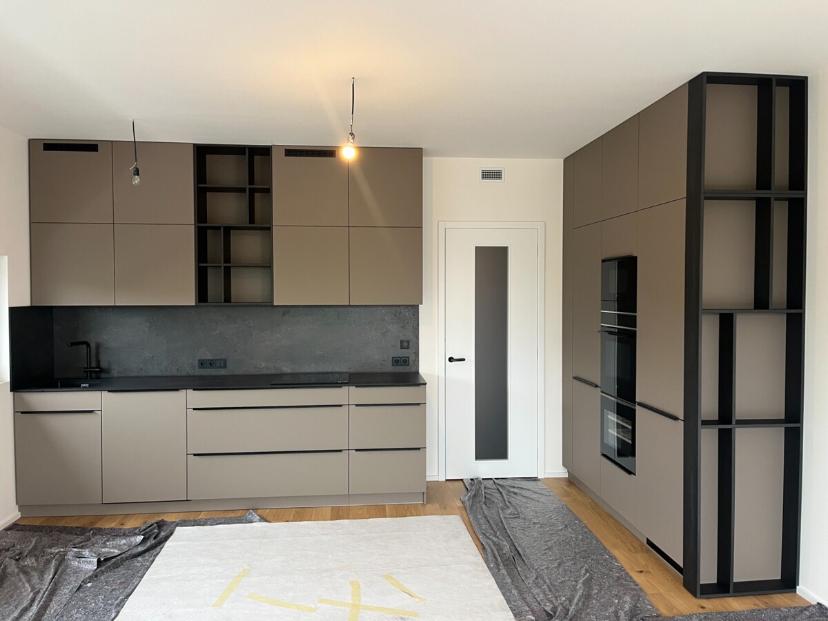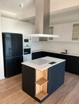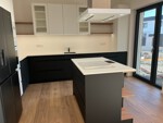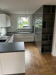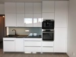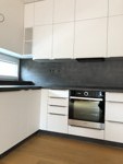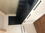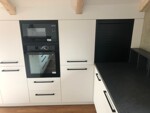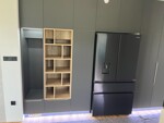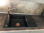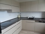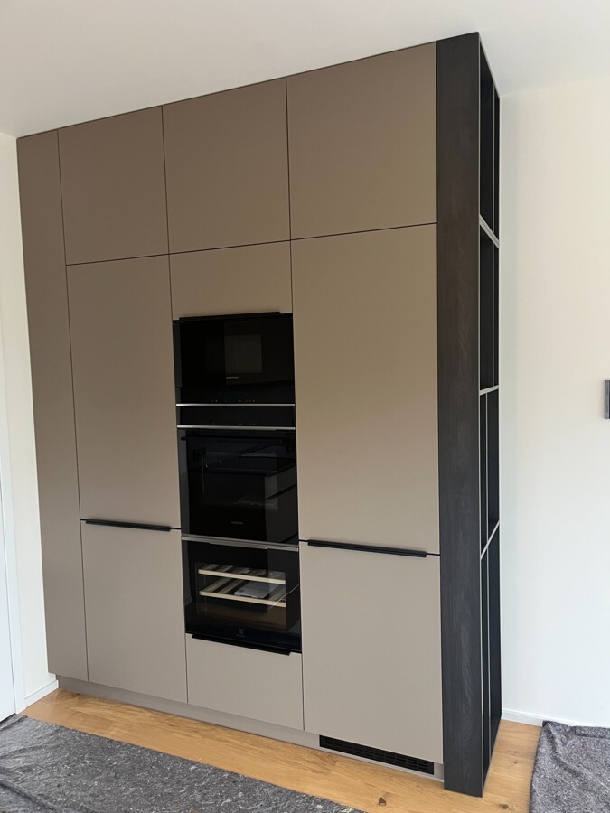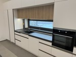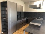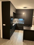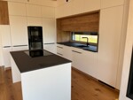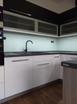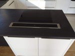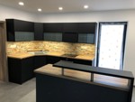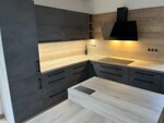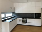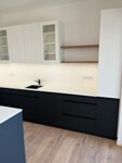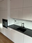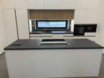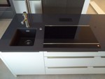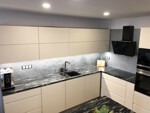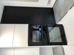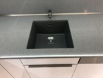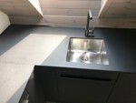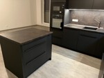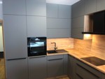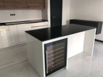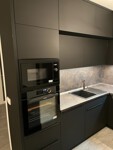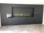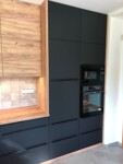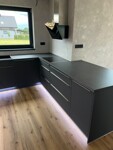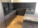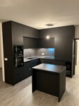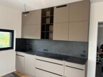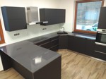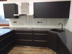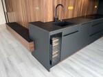 Dvířka a pohledové boky černá matt, zadní deska sklo Float, pracovní deska Lapitec Nero Antracite Lux,