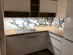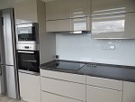 Dvířka a pohledové boky Latté lesk, korpus Latté, pracovní deska Mramor levano bílý, zadní deska sklo