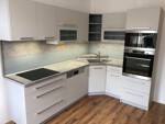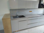 Dvířka + pohledové boky Alpská bílá lesk, pracovní deska šedá štuk, zadní deska sklo Grey