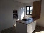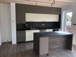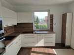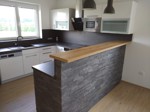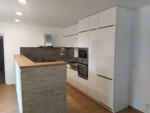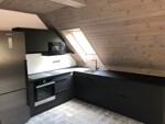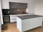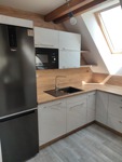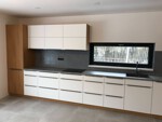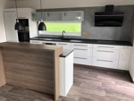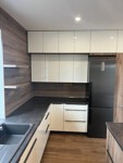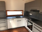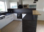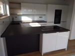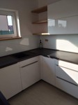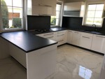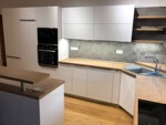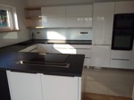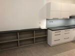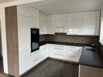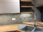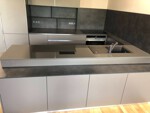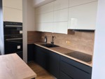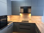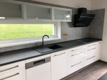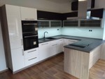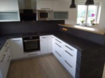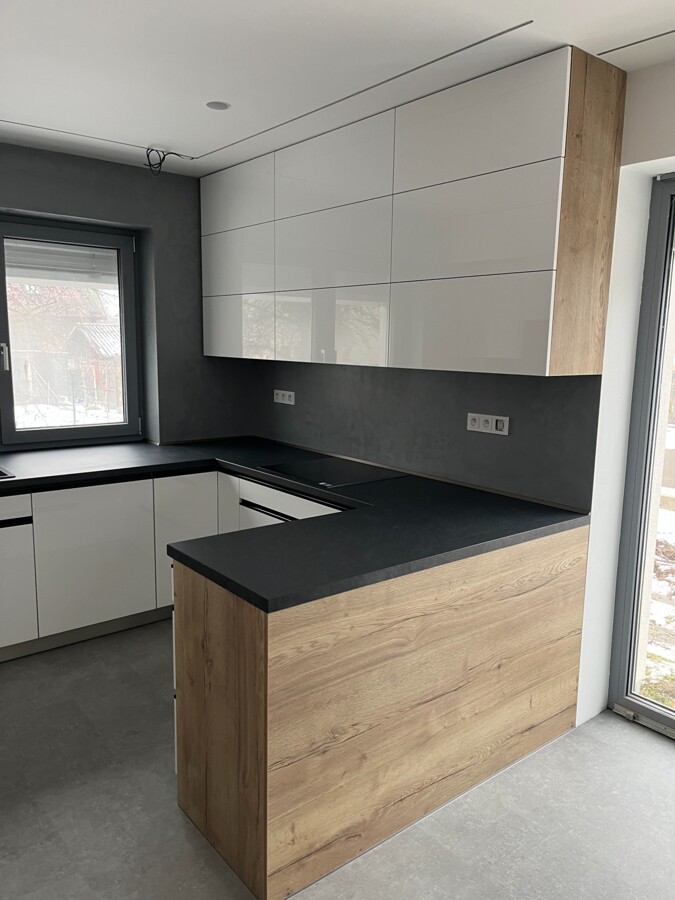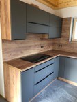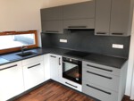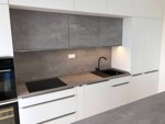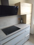 Dvířka Prachově šedá Matt, Alpská bílá lesk. Pracovní deska Břidlice Jura antracitová, zadní deska Břidlice Jura antracitová