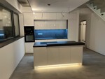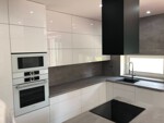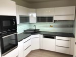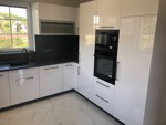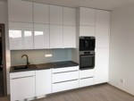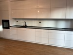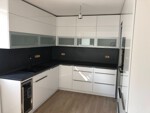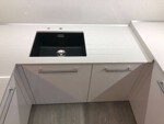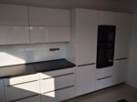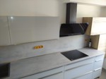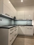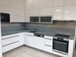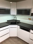 Dvířka a pohledové boky Alpská bílá lesk, korpus Pearl White, pracovní deska Technistone Crystal Antracit Pure, zadní deska sklo