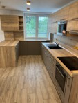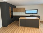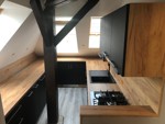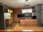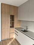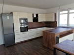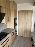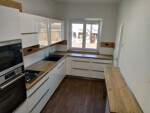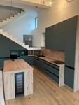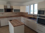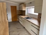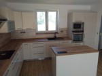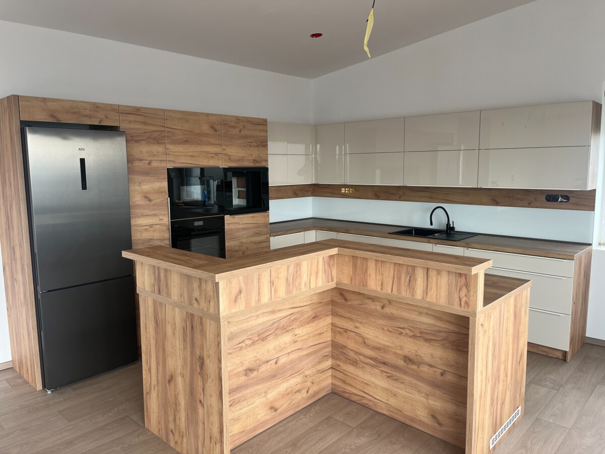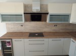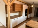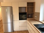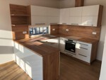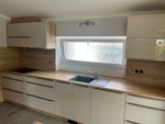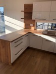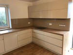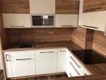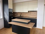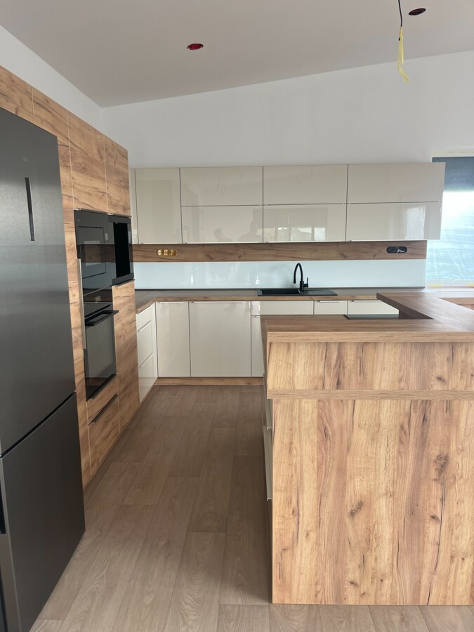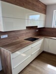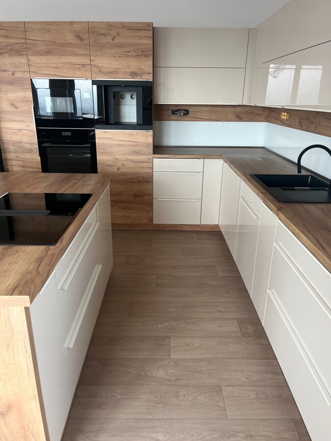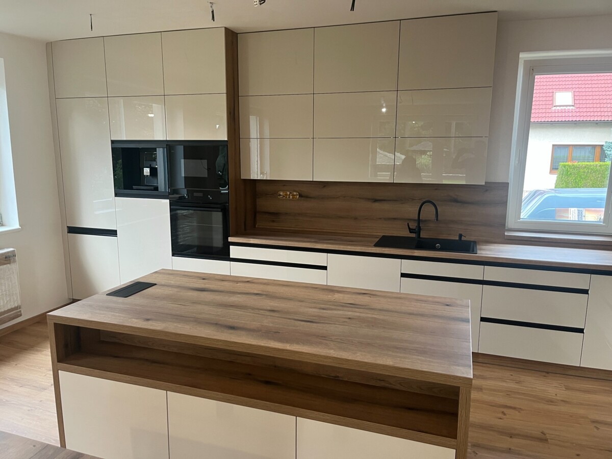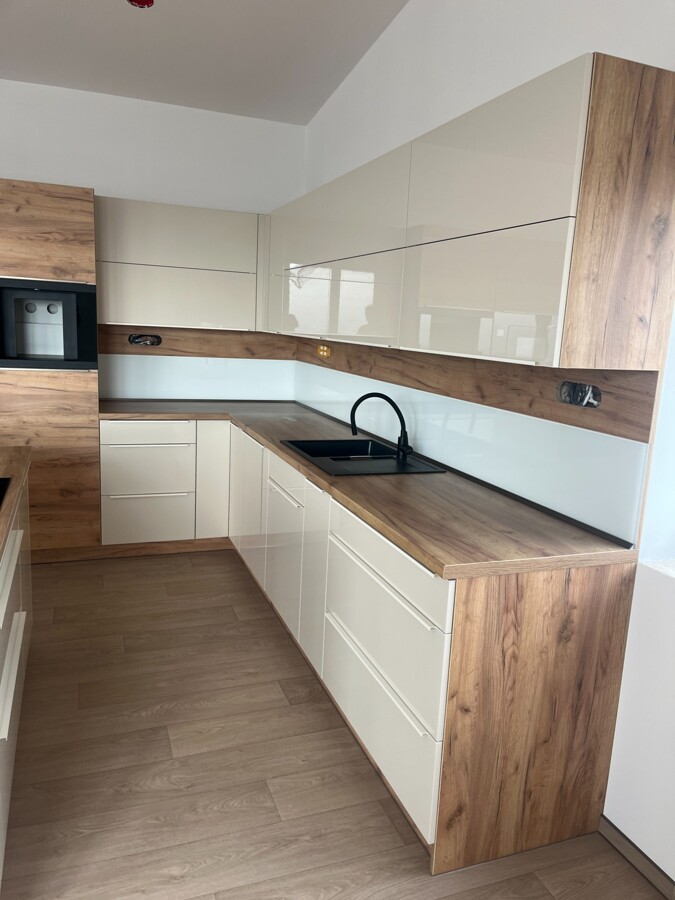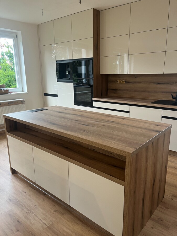 Dvířka krémově béžová matt, lamino a zadní deska Dub ENDgrain koňak, pracovní deska Dub ENDgrain koňak.