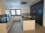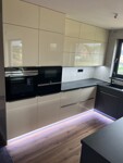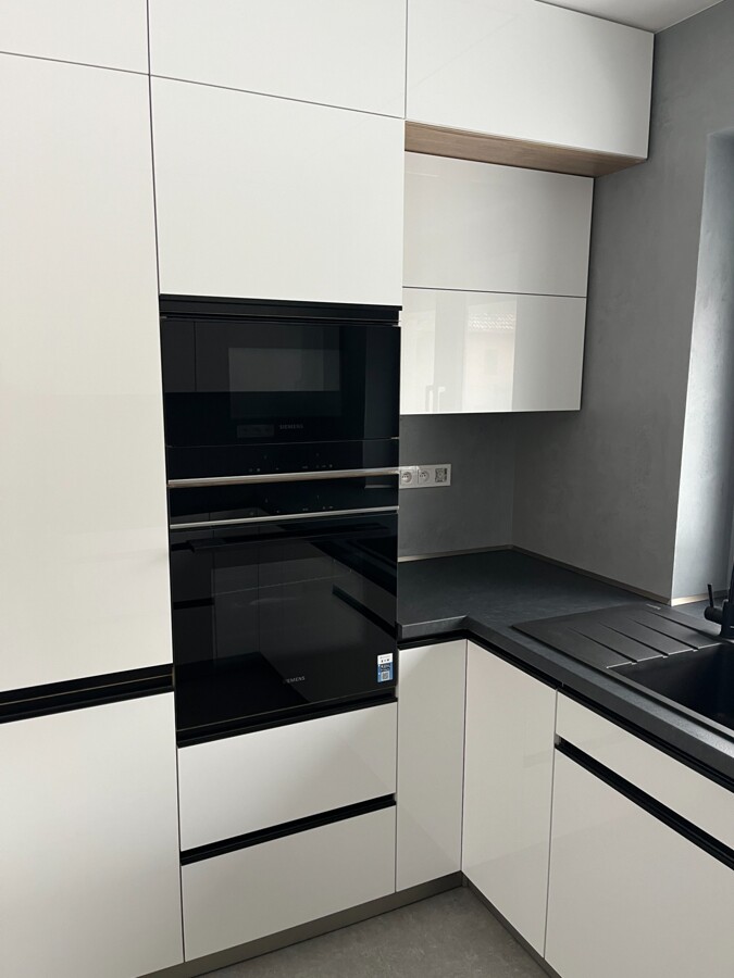 Dvířka Alpská bílá lesk a Antracit lesk, pohledové boky Alpská bílá lesk, zadní desla Sklo Window Grey, pracovní desla Lapitec Nero Antracite Lux
