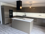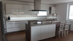 Dvířka Alpská bílá lesk, pohledové boky Alpská bílá lesk, boky ostrůvku, zadní deska a pracovní deska Beton šedý