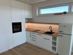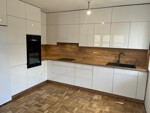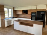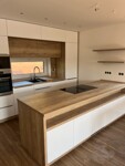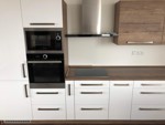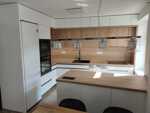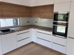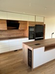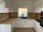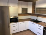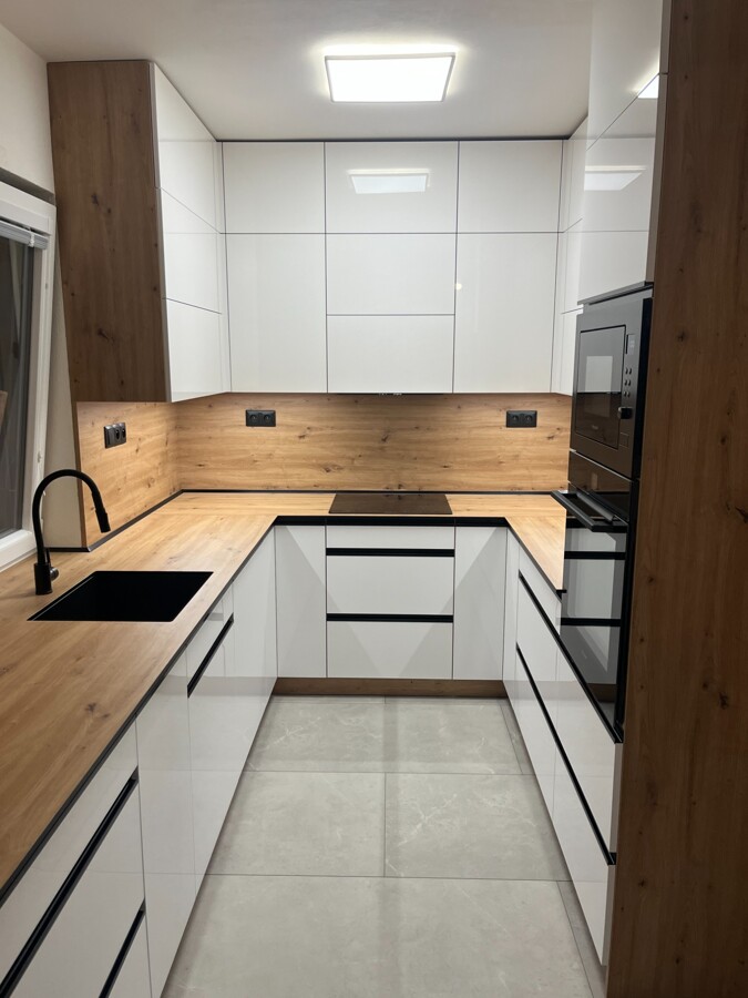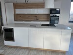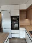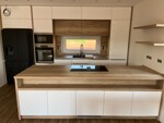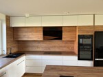 Dvířka prémiově bílá Matt, pohledové boky prémiově bílá Matt, dvířka horní Gold Caft Oak, pracovní kompaktní deska Slim Line Venato, zadní deska sklo Standard Float