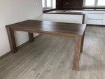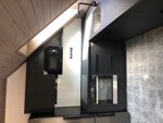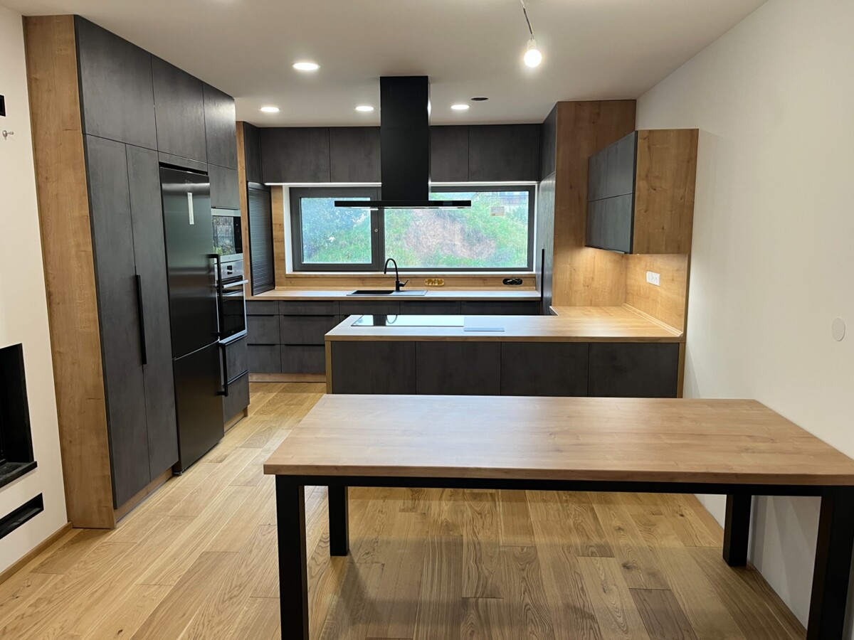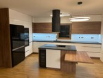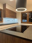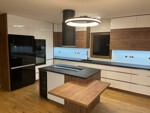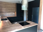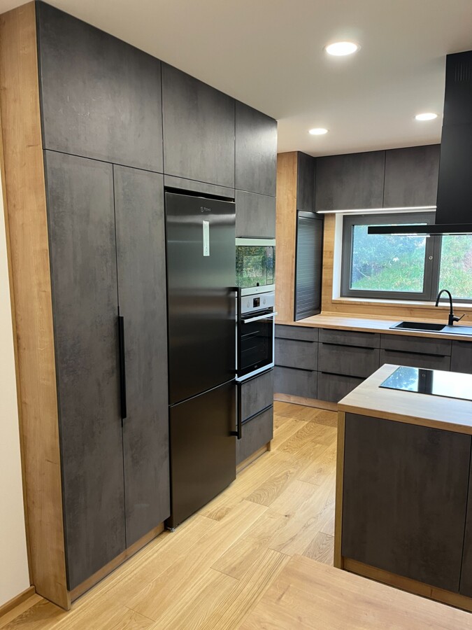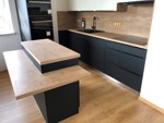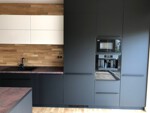 Dvířka černá mat a Smoked Walnut, pracovní deska Lapitec Nero assoluto vesuvio, zadní deska Smoked Walnut