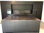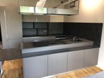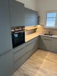 Dvířka Kašmírově šedá mat a Gravitově šedá mat, zadní deska Kašmírově šedá, pracovní deska Břidlice Scivaro