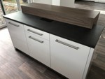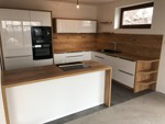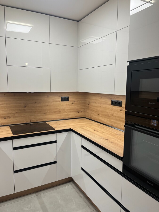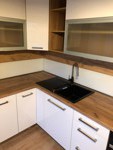 Dvířka Alabastrově bílá lesk + Černá matt, korpus a pracovní deska Dub Endgrain klasik, zadní deska Dub Endgrain klasik