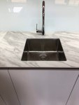Dvířka Alpská bílá Matt, korpus Stone Grey, pracovní a zadní deska Břidlice Jura antracitová.