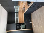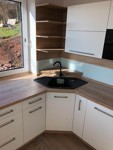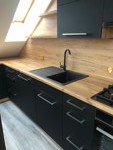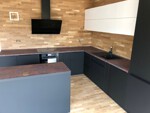 Dvířka a pohledové boky černá Matt + Alpská bílá lesk, pracovní deska Rusty Iron