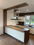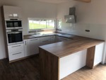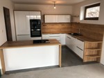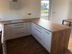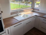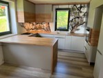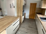 Dvířka Senosan krémová bílá, korpus Kaindl Dub Endgrain koňak, pracovní deska Dub Engrain koňak