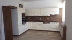 Dvířka a pohledové boky Ivory a Satin lesk, lamino Stone Grey, pracovní deska Třešeň divoká