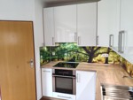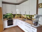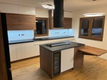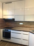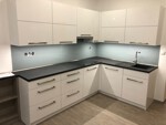 Dvířka a pohledové boky Alpská bílá lesk, zadní deska sklo Extra čiré, pracovní deska Black Porphyry