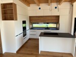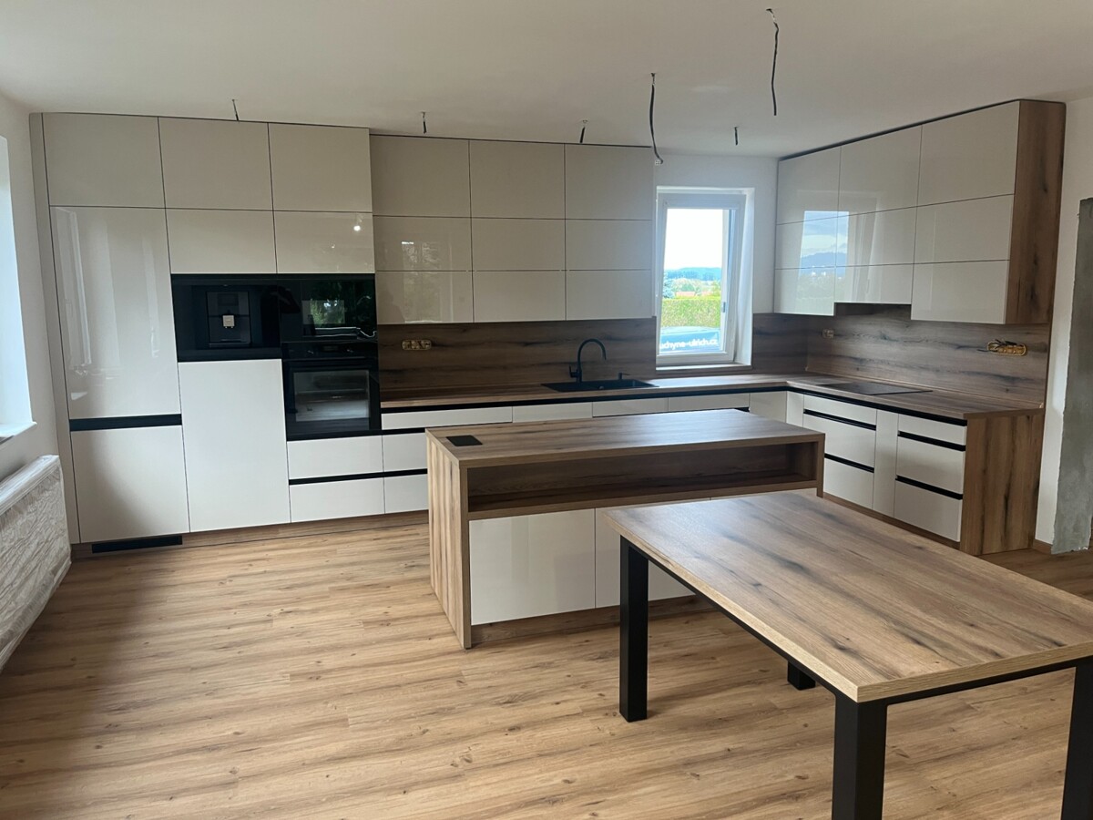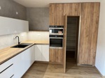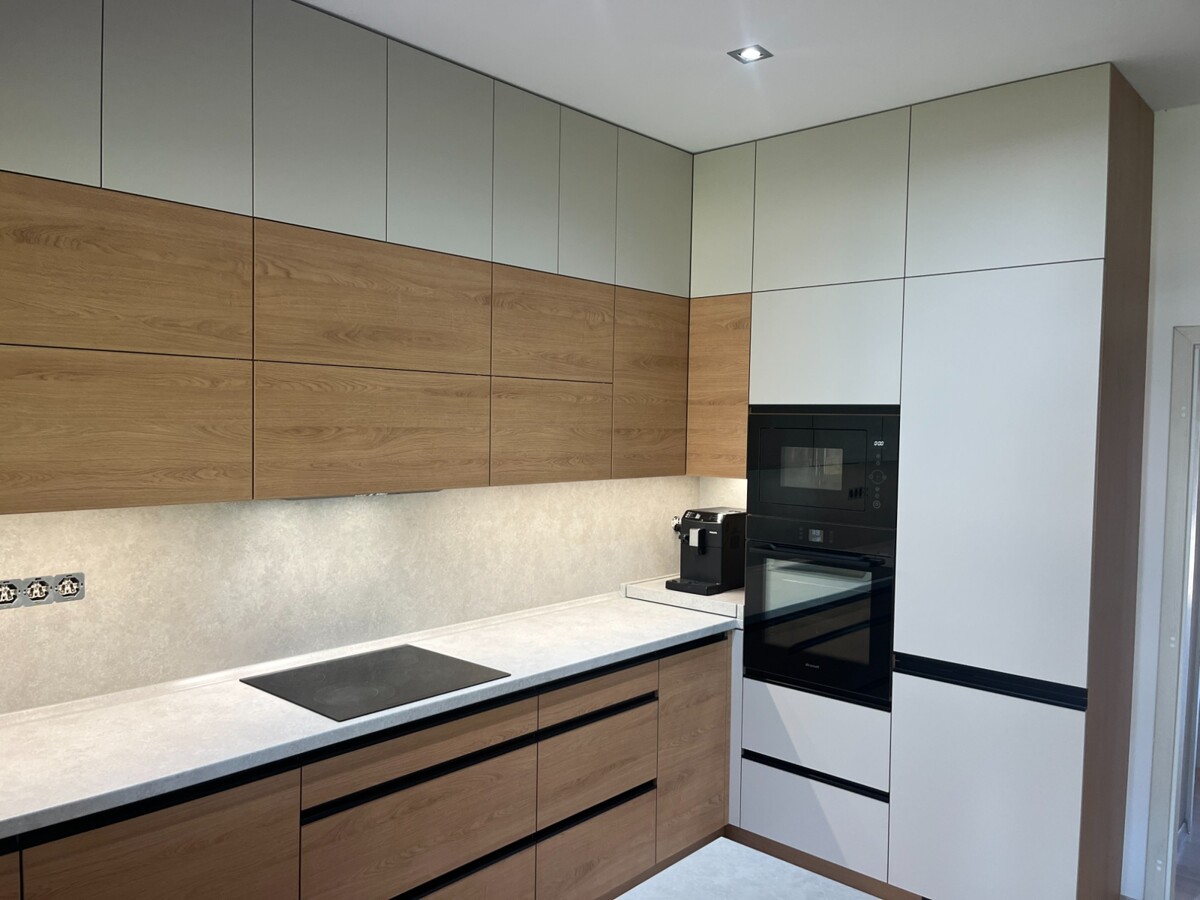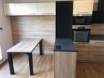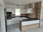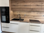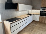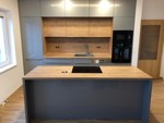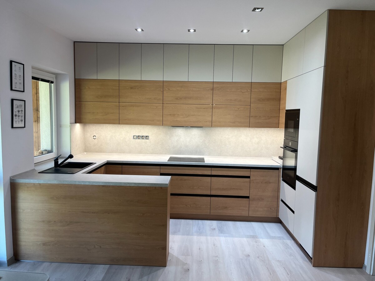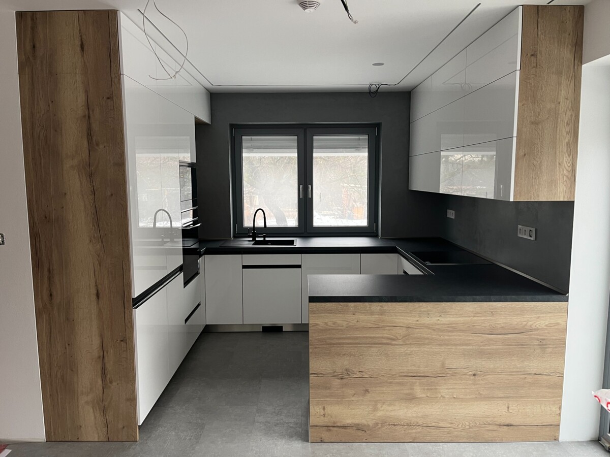 Dvířka Alpská bílá Matt a Gold Craft Oak, zadní deska Gold Craft Oak, pracovní deska Lapitec Nero Antracite Lithos