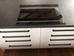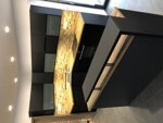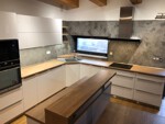 Dvířka Alpská bílá lesk, lamino Raw Endgrain Oak, zadní deska sklo, pracovní deska břidlice jura antracitová