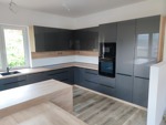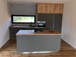 Dvířka grafitově šedá Matt, zadní deska beton šedý, pracovní deska a korpus Gold Craft Oak