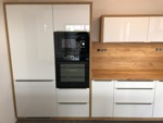 Dvířka prémiově bílá Matt, lamino Dub Nebraska přírodní, zadní deska sklo Glitters bílé + lamino Dub Nebraska přírodní, pracovní deska Dub Nebraska přírodní.