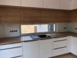 Dvířka Alpská bílá lesk, lamino Dub lanýžově hnědý, pracovní deska Linen Block Wood, zadní deska sklo Extra čiré + HPL deska Linen Block Wood