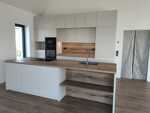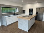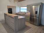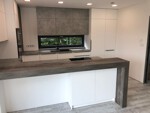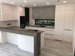 Dvířka a pohledové boky Alpská bílá Matt. Horní dvířka Beton Chicago, pracovní deksa Beton Chicago, bar Pinie Pasadena