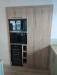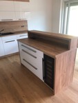 Dvířka Aplská bílá lesk, bar Dub Hamilton přírodní, pracovní a zadní deska Mocca, pohledové boky Alpská bílá lesk.