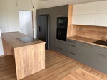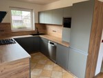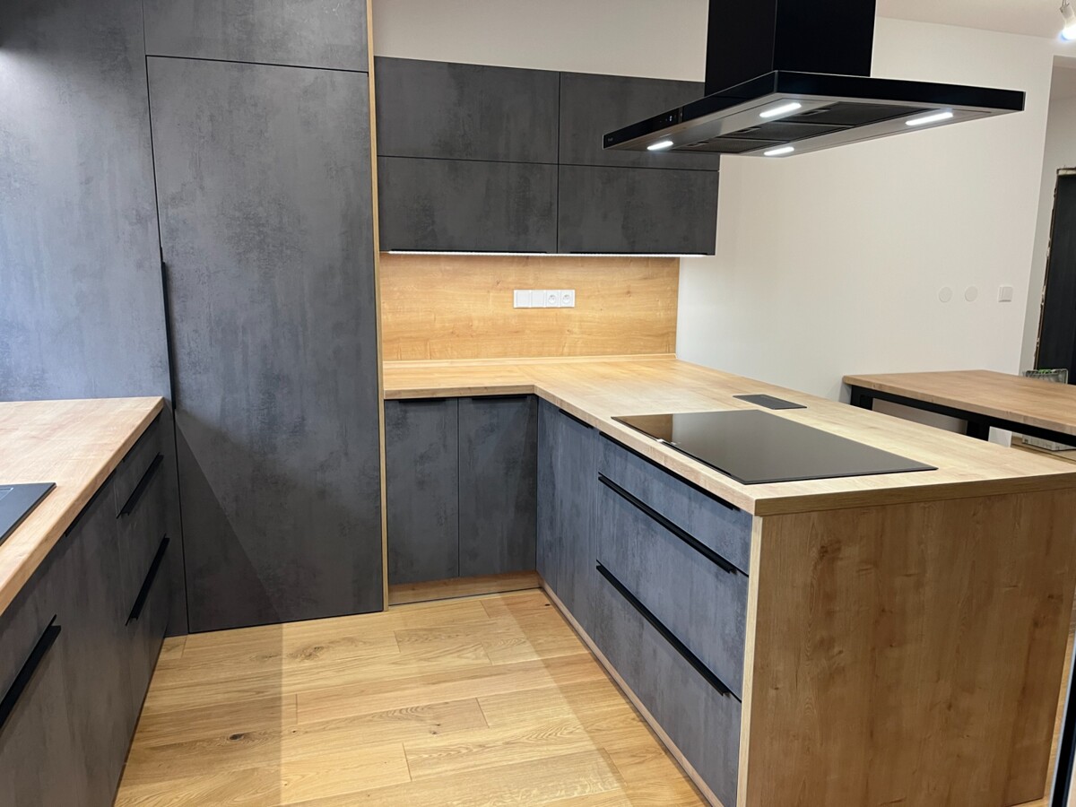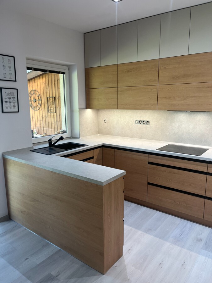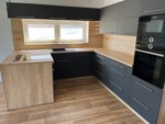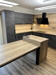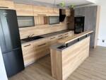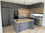 Dvířka a pohledové boky Beton tmavě šedý, horní skříňky Dub Halifax přírodní, korpus Grafitově šedá a Dub Halifax přírodní, pracovní deska Dub Halifax přírodní