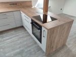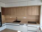 Dvířka Alpská bílá lesk a Dub Hamilton přírodní, korpus Dub Hamilton přírodní, pracovní deska Dub Hamiton přírodní.
