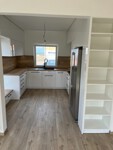 Dvířka Pearl White SM, korpus Pearl White SM, pracovní deska a police Dub Hickory přírodní