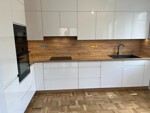 Dvířka Alpská bílá lesk, zadní deska Dub ENDgrain koňak, pracovní deska a lamino Dub ENDgrain koňak