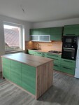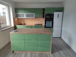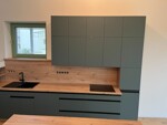 Dvířka Šalvějově zelená, zadní deska a korpus Dub Davenport přírodní světlý, pracovní deska Dub Davenport světlý