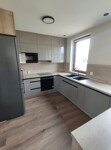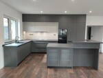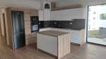 Dvířka Alpská bílá lesk, Grafitově šedá Matt, Dub Fresh, pracovní deska Technistone Gobi Black, zadní deska Technistone Crystal Absolute White, korpus Stone Grey